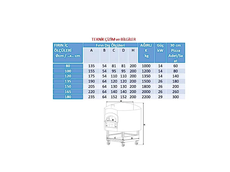 | FIRIN İÇ ÖLÇÜLERİ ∅cm / ..x.. cm | Fırın Dış Ölçüleri | AĞIRLIK kg | Güç kW | 30 cm Pizza Adet/Saat |